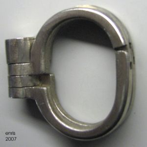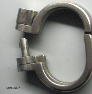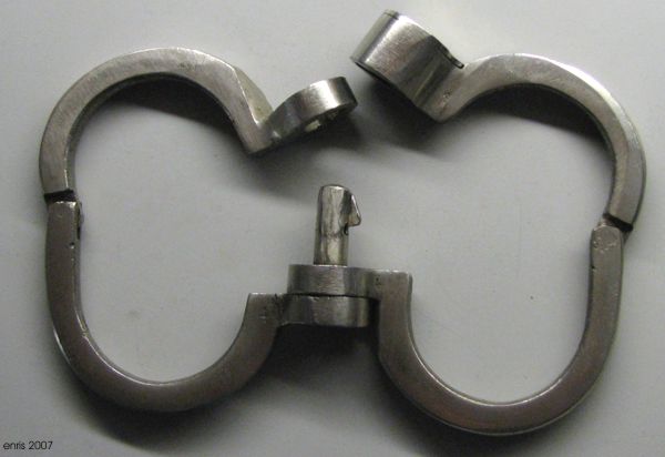 Hier eine sehr seltene Handschelle des deutschen Herstellers Kayser, der auch die echte "Hamburger Acht", eigentlich Modell Nr. 5, produziert hatte. Es handelt sich um ein voll funktionsfähiges und schönes Original, auch wenn das Finish nicht mehr vorhanden ist. Kayser und Hiatt sind sich sehr ähnlich, was die Form und die fünf Schließpositionen betrifft (Clejuso-Darbies haben dagegen sieben). Die Kayser hat aber geringfügige Unterschiede, z.B. keine Hammerspuren auf dem Verschlussdeckel (bei den Hiatts sind es immer solche "X" oder "Y", durch die der Deckel verstemmt wird). Auch passt der Schlüssel nicht und die Verbindung ist etwas anders. Besonders ist auch die abgerundete Form der Bügelspitze.